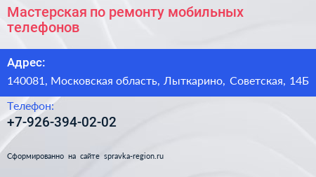 Мастерская по ремонту мобильных телефонов по адресу 140081, Московская область, Лыткарино, Советская, 14Б в дальнейшем Организация, размещена в следующих категориях: