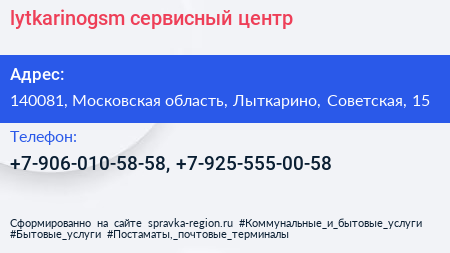 lytkarinogsm, сервисный центр по адресу 140081, Московская область, Лыткарино, Советская, 15 в дальнейшем Организация, размещена в следующих категориях: