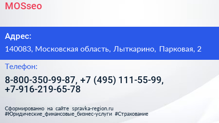MOSseo по адресу 140083, Московская область, Лыткарино, Парковая, 2 в дальнейшем Организация, размещена в следующих категориях: