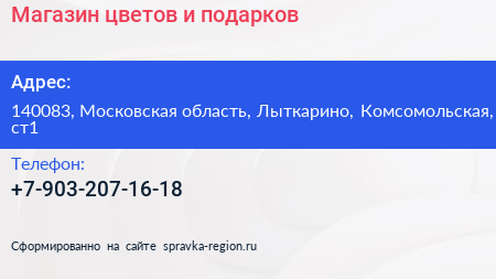 Магазин цветов и подарков по адресу 140083, Московская область, Лыткарино, Комсомольская, ст1 в дальнейшем Организация, размещена в следующих категориях: