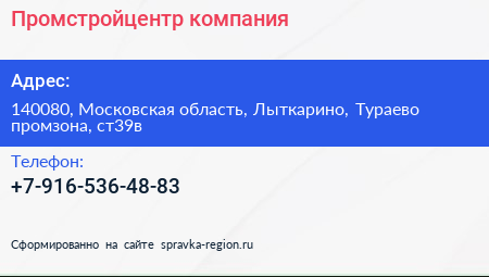 Промстройцентр, компания по адресу 140080, Московская область, Лыткарино, Тураево промзона, ст39в в дальнейшем Организация, размещена в следующих категориях: