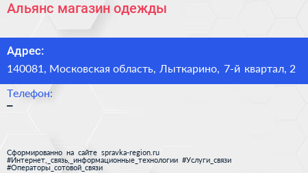 Альянс, магазин одежды по адресу 140081, Московская область, Лыткарино, 7-й квартал, 2 в дальнейшем Организация, размещена в следующих категориях: