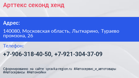 Арттекс, секонд-хенд по адресу 140080, Московская область, Лыткарино, Тураево промзона, 26 в дальнейшем Организация, размещена в следующих категориях: