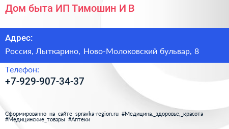 Дом быта, ИП Тимошин И.В. по адресу 8, Ново-Молоковский бульвар, Жилой комплекс "Ново-Молоково", Молоково, Ленинский городской округ, Московская область, Центральный федеральный округ, 142714, Россия в дальнейшем Организация, размещена в следующих категориях: