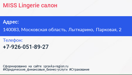 MISS Lingerie, салон по адресу 140083, Московская область, Лыткарино, Парковая, 2 в дальнейшем Организация, размещена в следующих категориях: