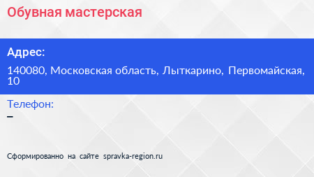 Обувная мастерская по адресу 140080, Московская область, Лыткарино, Первомайская, 10 в дальнейшем Организация, размещена в следующих категориях: