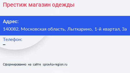 Престиж, магазин одежды по адресу 140082, Московская область, Лыткарино, 1-й квартал, 3а в дальнейшем Организация, размещена в следующих категориях: