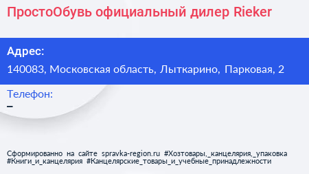 ПростоОбувь, официальный дилер Rieker по адресу 140083, Московская область, Лыткарино, Парковая, 2 в дальнейшем Организация, размещена в следующих категориях: