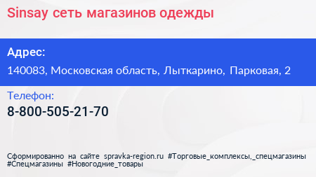 Sinsay, сеть магазинов одежды по адресу 140083, Московская область, Лыткарино, Парковая, 2 в дальнейшем Организация, размещена в следующих категориях: