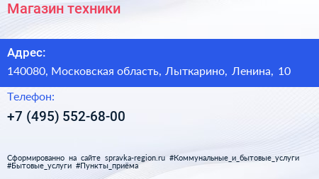 Магазин техники по адресу 140080, Московская область, Лыткарино, Ленина, 10 в дальнейшем Организация, размещена в следующих категориях: