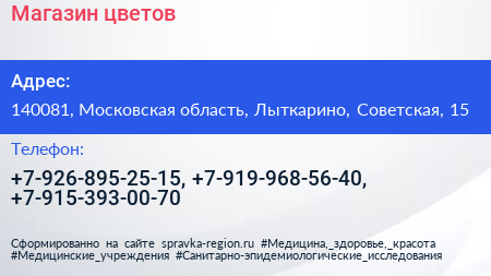Магазин цветов по адресу 140081, Московская область, Лыткарино, Советская, 15 в дальнейшем Организация, размещена в следующих категориях: