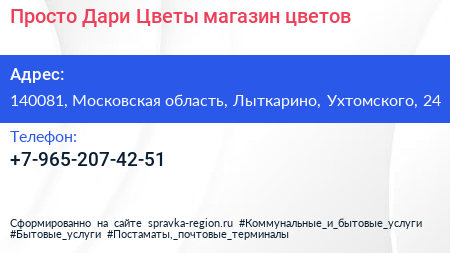 Просто Дари Цветы, магазин цветов по адресу 140081, Московская область, Лыткарино, Ухтомского, 24 в дальнейшем Организация, размещена в следующих категориях: