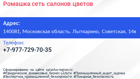 Ромашка, сеть салонов цветов по адресу 140081, Московская область, Лыткарино, Советская, 14в в дальнейшем Организация, размещена в следующих категориях:
