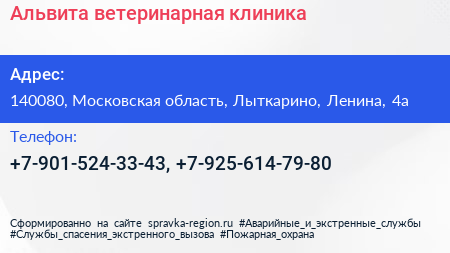 Альвита, ветеринарная клиника по адресу 140080, Московская область, Лыткарино, Ленина, 4а в дальнейшем Организация, размещена в следующих категориях:
