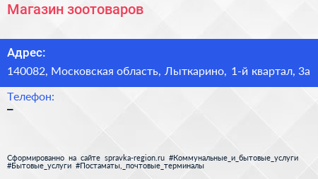 Магазин зоотоваров по адресу 140082, Московская область, Лыткарино, 1-й квартал, 3а в дальнейшем Организация, размещена в следующих категориях: