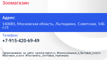 Зоомагазин по адресу 140081, Московская область, Лыткарино, Советская, 14Б ст3 в дальнейшем Организация, размещена в следующих категориях: