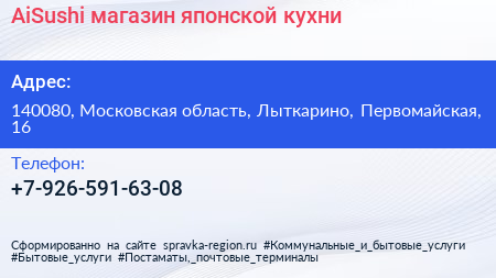 AiSushi, магазин японской кухни по адресу 140080, Московская область, Лыткарино, Первомайская, 16 в дальнейшем Организация, размещена в следующих категориях: