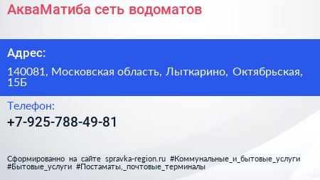 АкваМатиба, сеть водоматов по адресу 140081, Московская область, Лыткарино, Октябрьская, 15Б в дальнейшем Организация, размещена в следующих категориях: