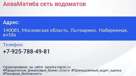 АкваМатиба, сеть водоматов по адресу 140081, Московская область, Лыткарино, Набережная, вл18а в дальнейшем Организация, размещена в следующих категориях: