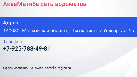 АкваМатиба, сеть водоматов по адресу 140080, Московская область, Лыткарино, 7-й квартал, 5в в дальнейшем Организация, размещена в следующих категориях: