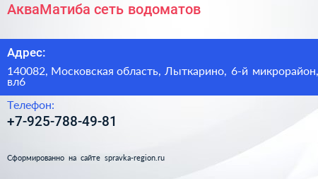 АкваМатиба, сеть водоматов по адресу 140082, Московская область, Лыткарино, 6-й микрорайон, вл6 в дальнейшем Организация, размещена в следующих категориях:
