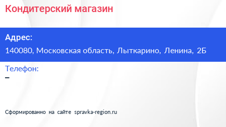 Кондитерский магазин по адресу 140080, Московская область, Лыткарино, Ленина, 2Б в дальнейшем Организация, размещена в следующих категориях: