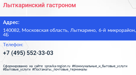Лыткаринский, гастроном по адресу 140082, Московская область, Лыткарино, 6-й микрорайон, 4Б в дальнейшем Организация, размещена в следующих категориях: