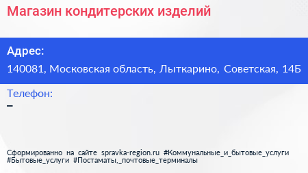 Магазин кондитерских изделий по адресу 140081, Московская область, Лыткарино, Советская, 14Б в дальнейшем Организация, размещена в следующих категориях: