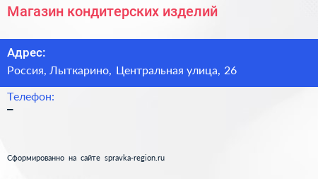 Магазин кондитерских изделий по адресу 26, Центральная улица, Большая Володарка, посёлок Володарского, Ленинский городской округ, Московская область, Центральный федеральный округ, 142713, Россия в дальнейшем Организация, размещена в следующих категориях: