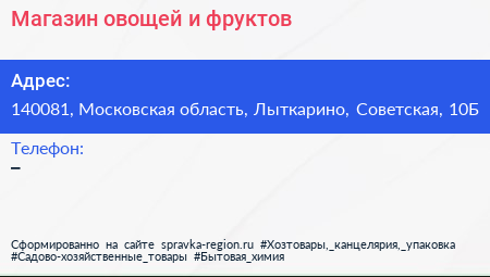 Магазин овощей и фруктов по адресу 140081, Московская область, Лыткарино, Советская, 10Б в дальнейшем Организация, размещена в следующих категориях: