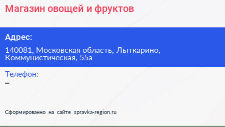 Магазин овощей и фруктов по адресу 140081, Московская область, Лыткарино, Коммунистическая, 55а в дальнейшем Организация, размещена в следующих категориях: