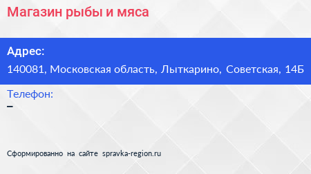 Магазин рыбы и мяса по адресу 140081, Московская область, Лыткарино, Советская, 14Б в дальнейшем Организация, размещена в следующих категориях: