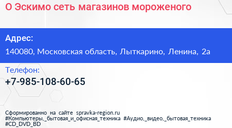 О! Эскимо, сеть магазинов мороженого по адресу 140080, Московская область, Лыткарино, Ленина, 2а в дальнейшем Организация, размещена в следующих категориях: