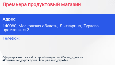Премьера, продуктовый магазин по адресу 140080, Московская область, Лыткарино, Тураево промзона, ст2 в дальнейшем Организация, размещена в следующих категориях: