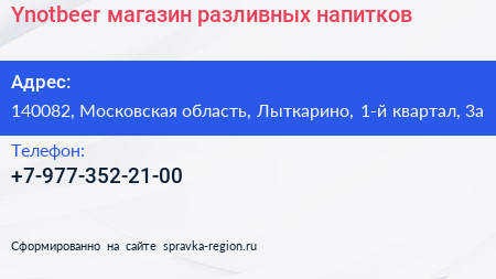 Ynotbeer, магазин разливных напитков по адресу 140082, Московская область, Лыткарино, 1-й квартал, 3а в дальнейшем Организация, размещена в следующих категориях: