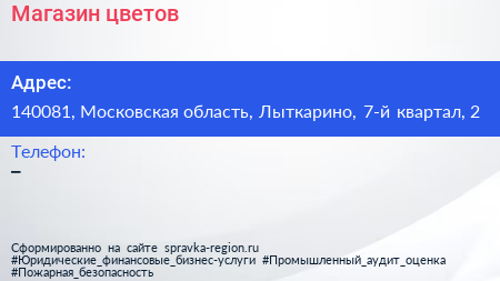 Магазин цветов по адресу 140081, Московская область, Лыткарино, 7-й квартал, 2 в дальнейшем Организация, размещена в следующих категориях: