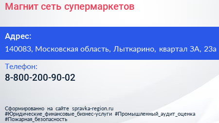 Магнит, сеть супермаркетов по адресу 140083, Московская область, Лыткарино, квартал ЗА, 23а в дальнейшем Организация, размещена в следующих категориях: