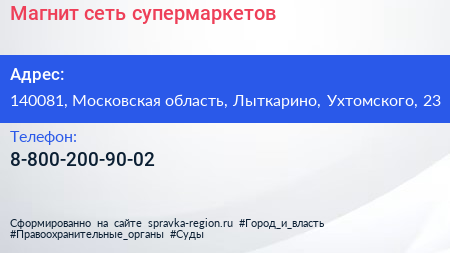 Магнит, сеть супермаркетов по адресу 140081, Московская область, Лыткарино, Ухтомского, 23 в дальнейшем Организация, размещена в следующих категориях: