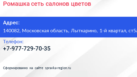 Ромашка, сеть салонов цветов по адресу 140082, Московская область, Лыткарино, 1-й квартал, ст5а в дальнейшем Организация, размещена в следующих категориях: