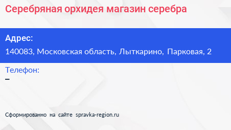 Серебряная орхидея, магазин серебра по адресу 140083, Московская область, Лыткарино, Парковая, 2 в дальнейшем Организация, размещена в следующих категориях: