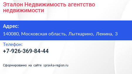 Эталон Недвижимость, агентство недвижимости по адресу 140080, Московская область, Лыткарино, Ленина, 3 в дальнейшем Организация, размещена в следующих категориях: