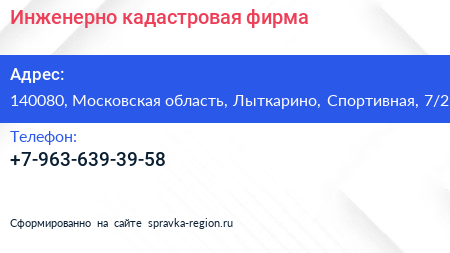 Инженерно-кадастровая фирма по адресу 140080, Московская область, Лыткарино, Спортивная, 7/2 в дальнейшем Организация, размещена в следующих категориях: