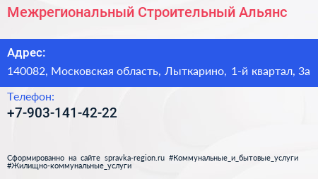 Межрегиональный Строительный Альянс по адресу 140082, Московская область, Лыткарино, 1-й квартал, 3а в дальнейшем Организация, размещена в следующих категориях: