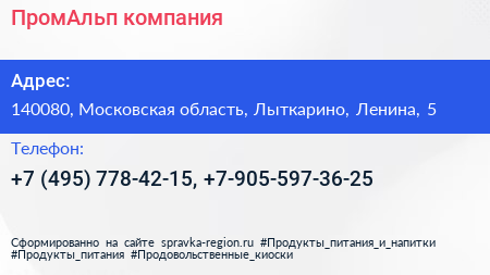 ПромАльп, компания по адресу 140080, Московская область, Лыткарино, Ленина, 5 в дальнейшем Организация, размещена в следующих категориях: