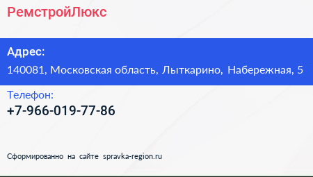 РемстройЛюкс по адресу 140081, Московская область, Лыткарино, Набережная, 5 в дальнейшем Организация, размещена в следующих категориях: