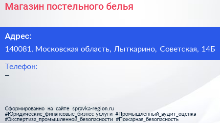 Магазин постельного белья по адресу 140081, Московская область, Лыткарино, Советская, 14Б в дальнейшем Организация, размещена в следующих категориях:
