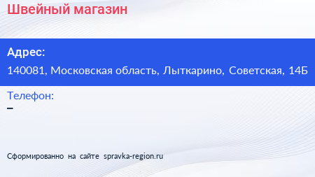Швейный магазин по адресу 140081, Московская область, Лыткарино, Советская, 14Б в дальнейшем Организация, размещена в следующих категориях: