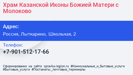 Храм Казанской Иконы Божией Матери, с. Молоково по адресу Церковь Иконы Божией Матери Казанская, Революционная улица, Молоково, Ленинский городской округ, Московская область, Центральный федеральный округ, 142714, Россия в дальнейшем Организация, размещена в следующих категориях: