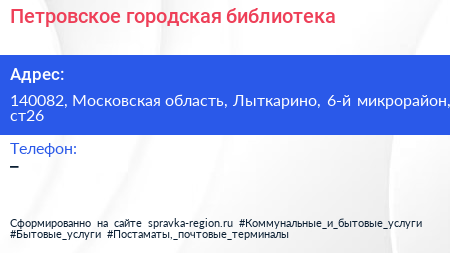 Петровское, городская библиотека по адресу 140082, Московская область, Лыткарино, 6-й микрорайон, ст26 в дальнейшем Организация, размещена в следующих категориях: