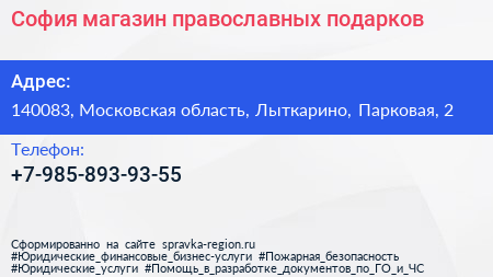 София, магазин православных подарков по адресу 140083, Московская область, Лыткарино, Парковая, 2 в дальнейшем Организация, размещена в следующих категориях: